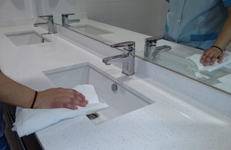Limpieza exhaustiva de superficies de trabajo, suelos, instalaciones sanitarias y áreas comunes en oficinas.